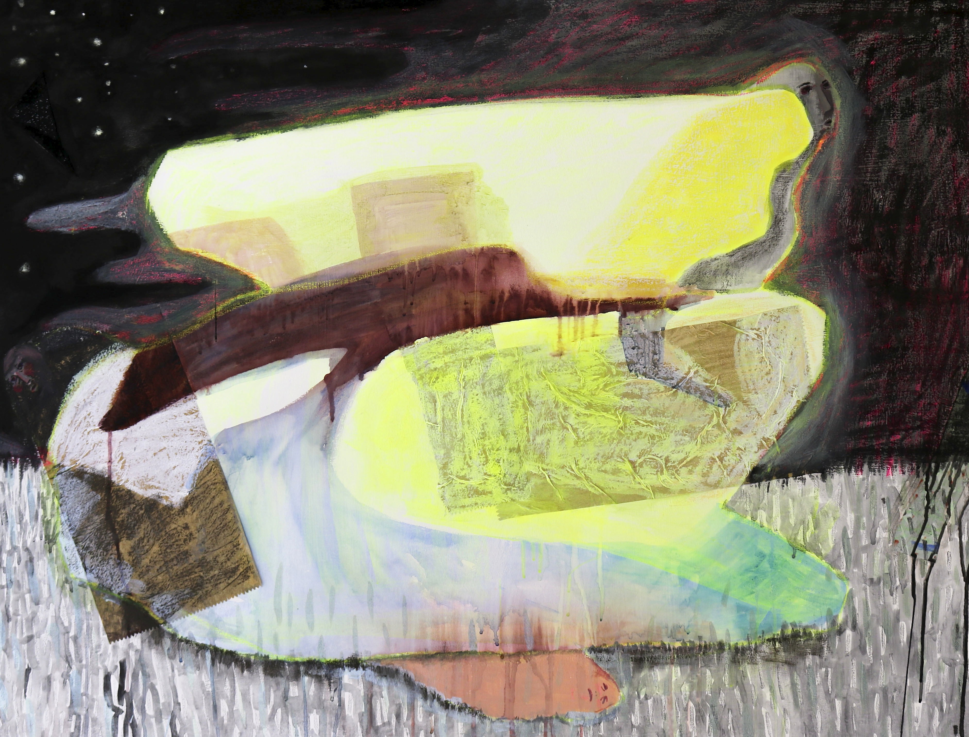 acrylic, watercolor, graphite powder, paper towel, and oil pastel on canvas, 3 ft x 4 ft